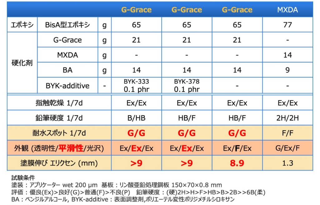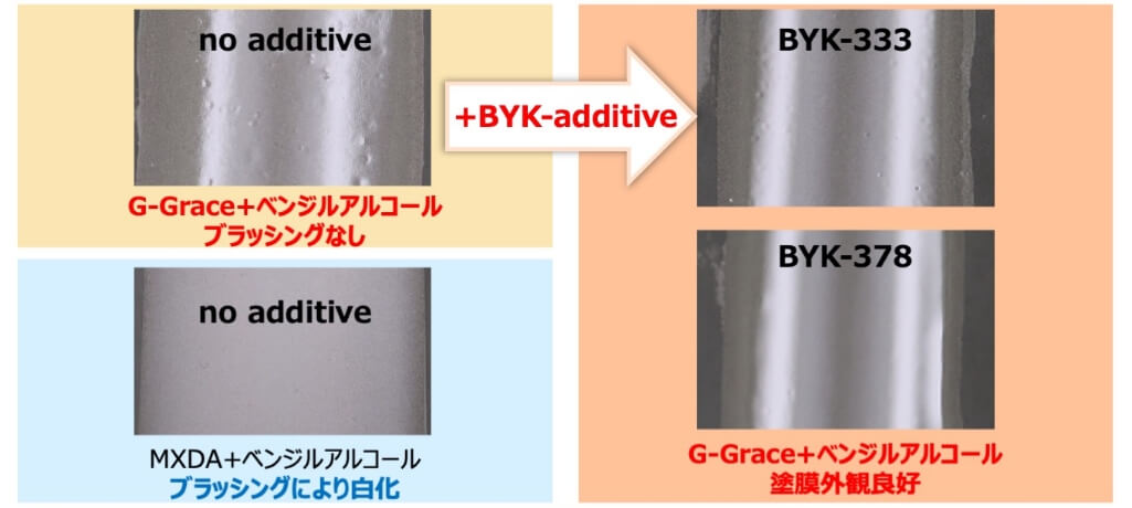 Gaskamine Graceとベンジルアルコールを併用した処方では、アミンブラッシングはなく良好な光沢の塗膜が得られます。さらに、BYK-333やBYK-378といった表面調整剤を添加することで、平滑性が改善し、良好な塗膜外観を得ることが可能です。