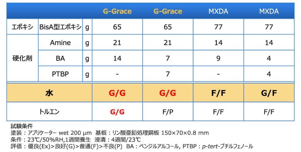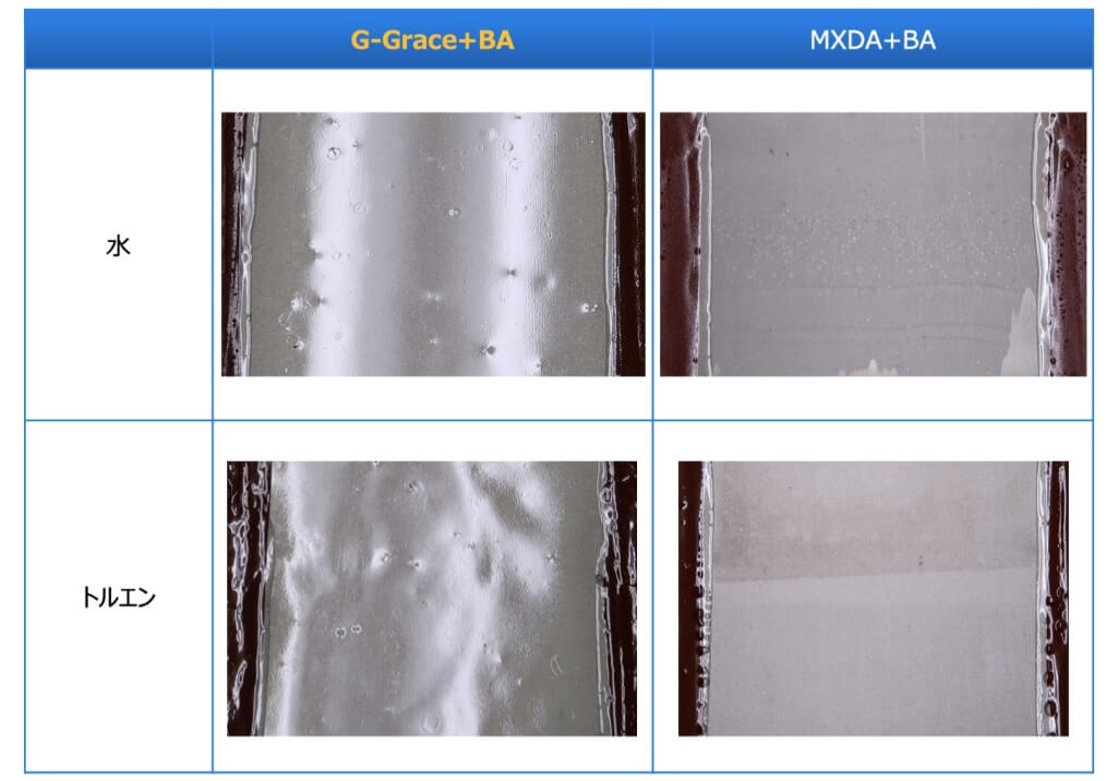 耐薬品性試験後の塗膜外観は、MXDA処方と比較して、耐水試験や耐トルエン試験後にも光沢があることがお分かりいただけると思います。