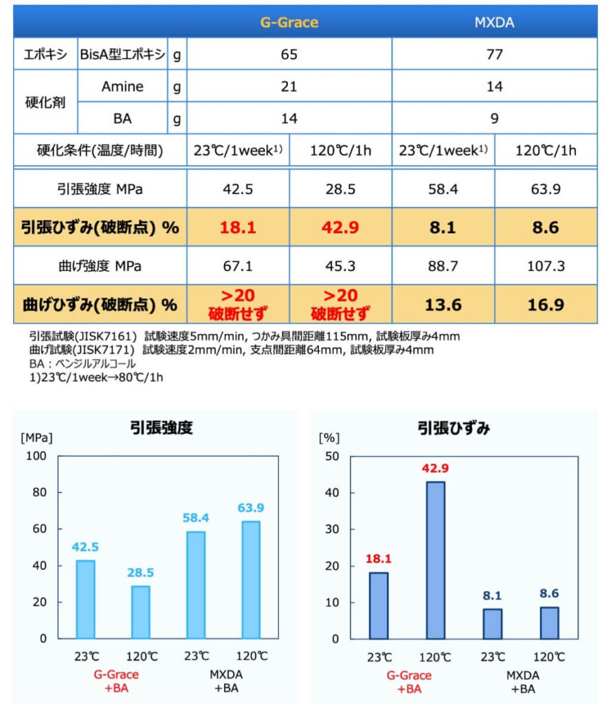 樹脂成形体の機械物性を測定した結果、エポキシ樹脂にも関わらず、引張・曲げひずみが大きく、非常に柔軟な成形体となることがわかりました。