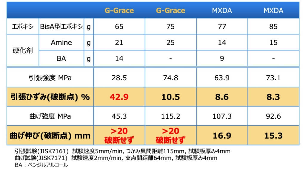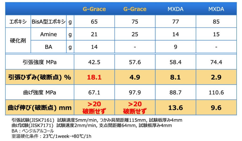 室温硬化を想定し、23℃/50%RH/1週間硬化での樹脂成形体の柔軟性をベンジルアルコールの添加の有無で比較しました。Gaskamine Graceは、BA未添加においても柔軟な成形体を与えますが、BAを添加することでさらに柔軟性を付与出来ることを確認しました。