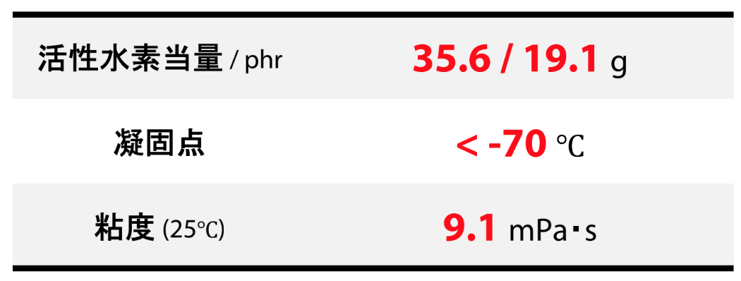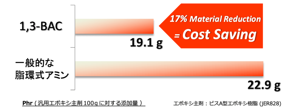 1,3-BACは競合アミンと比較して分子量が小さいことから、活性水素当量が低いことも特徴です。このことから、エポキシ樹脂100gに対する配合量を比較すると、20%ほど低減可能であり、コスト削減にも繋がります。