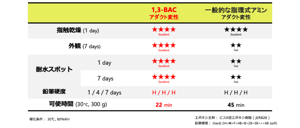 - 1,3-BACは速硬化性、優れた耐候性、高硬度、高Tgを有することから、大理石のコーティング用途のエポキシ硬化剤として好適です。