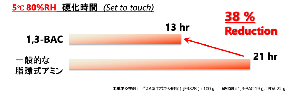 1,3-BACは、低温/高湿度下でも、競合アミンと比較して速硬化性を有します。そのため、冬場の施工においても速やかに硬化します。また、1,3-BACは冬場の低温においても凍結しないため、加温する必要がなく、工程の簡略化やエネルギー削減に繋がります。