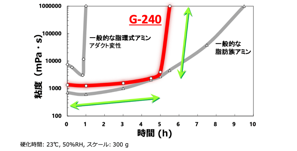 - G-240は、ロングポットライフでありながら、硬化が始まると速硬化性を有します。生産性の改善に貢献します。