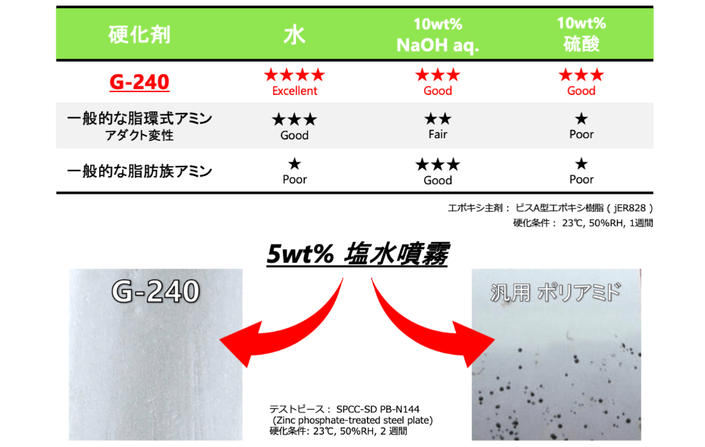 - G-240はMXDAをスチレンで変性したポリアミンです。アミンブラッシングの発生を抑制可能です。さらに、高い耐水性、耐薬品性を有します。